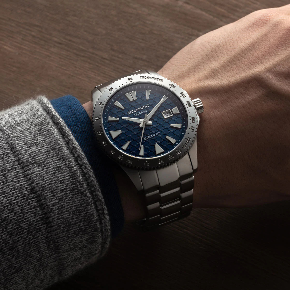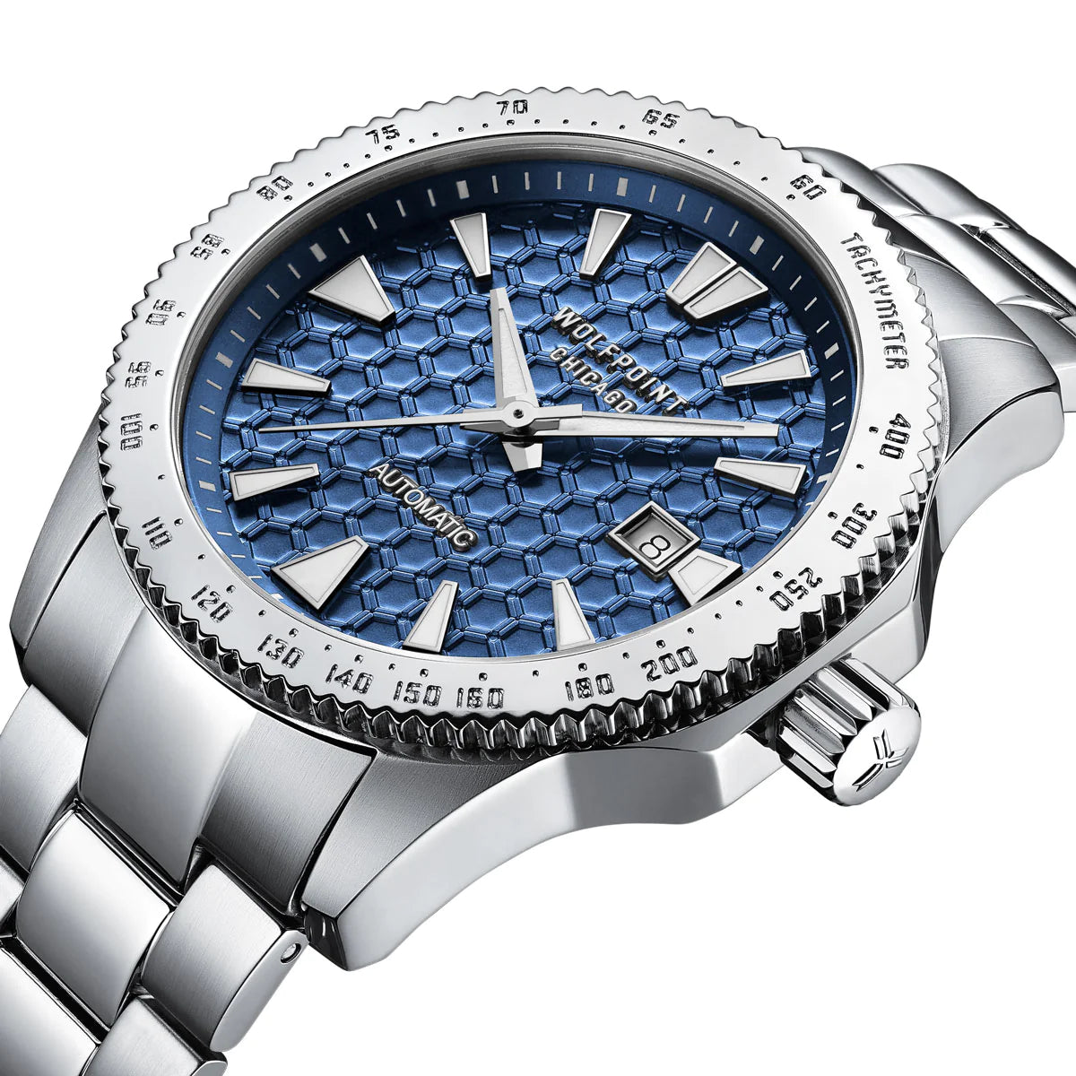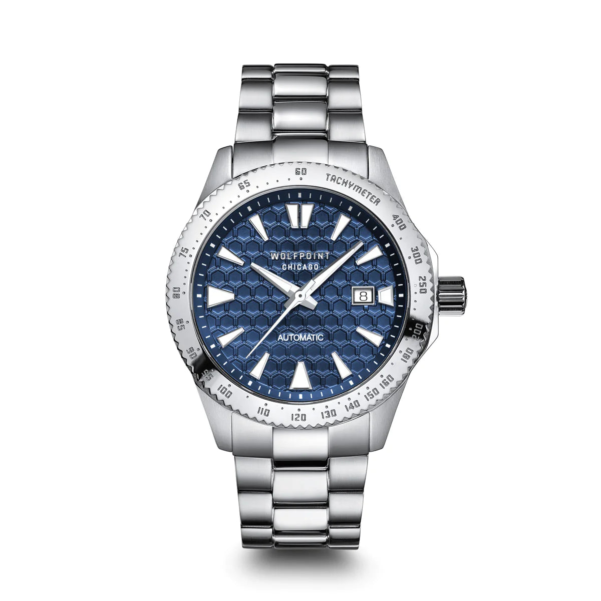 Designed to turn heads, this exclusive dial features an eye-catching pattern of the signature Wolfpoint "Y", raised stick indices, and a date window. This standout piece is offered in navy or silver to compliment any wardrobe or style.