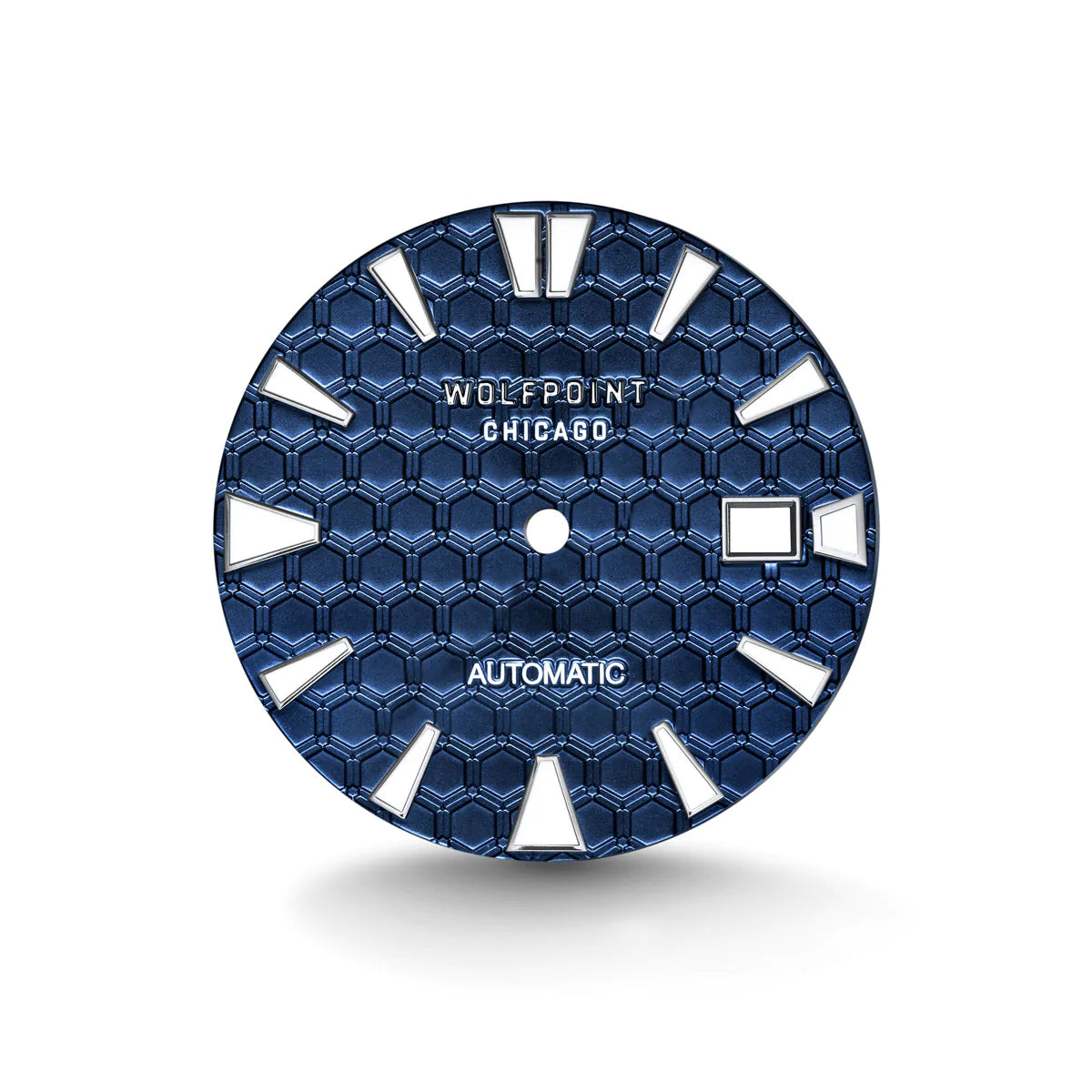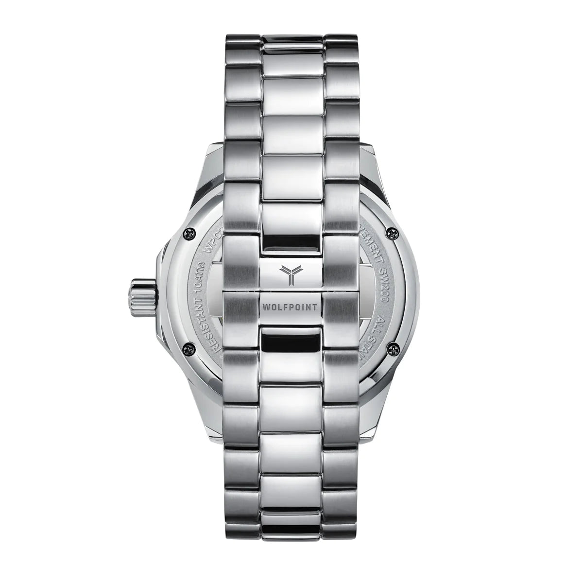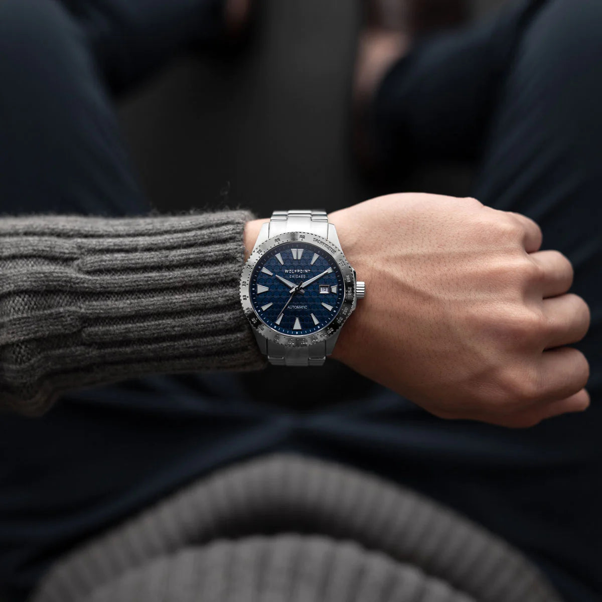 Designed to turn heads, this exclusive dial features an eye-catching pattern of the signature Wolfpoint "Y", raised stick indices, and a date window. This standout piece is offered in navy or silver to compliment any wardrobe or style.