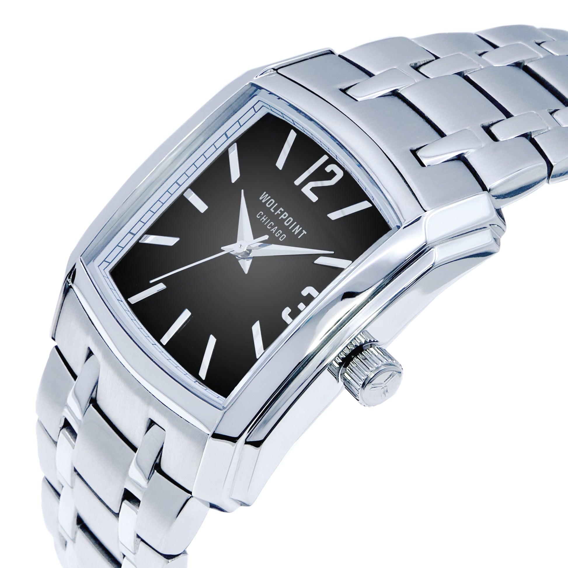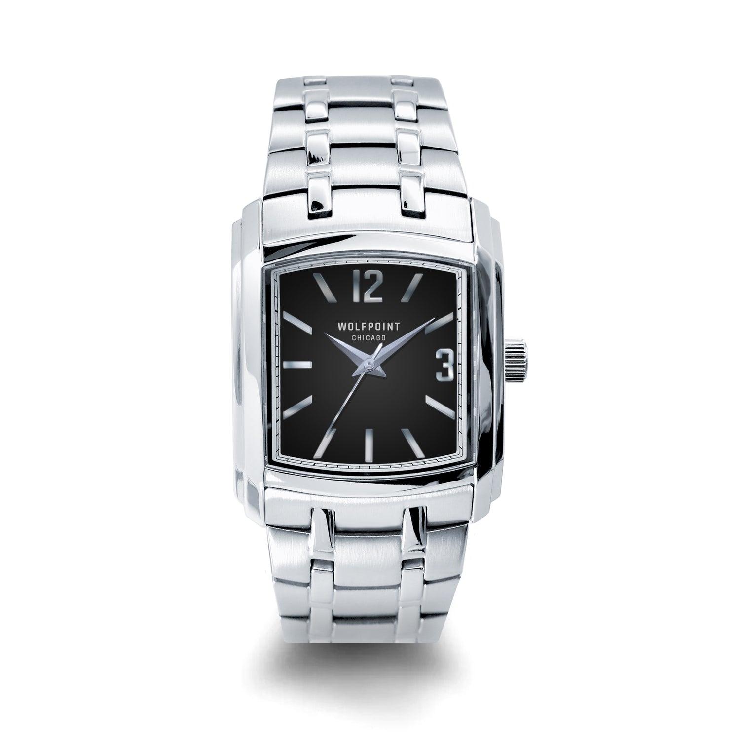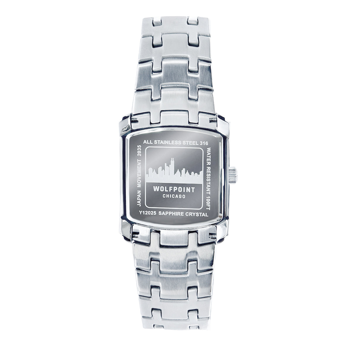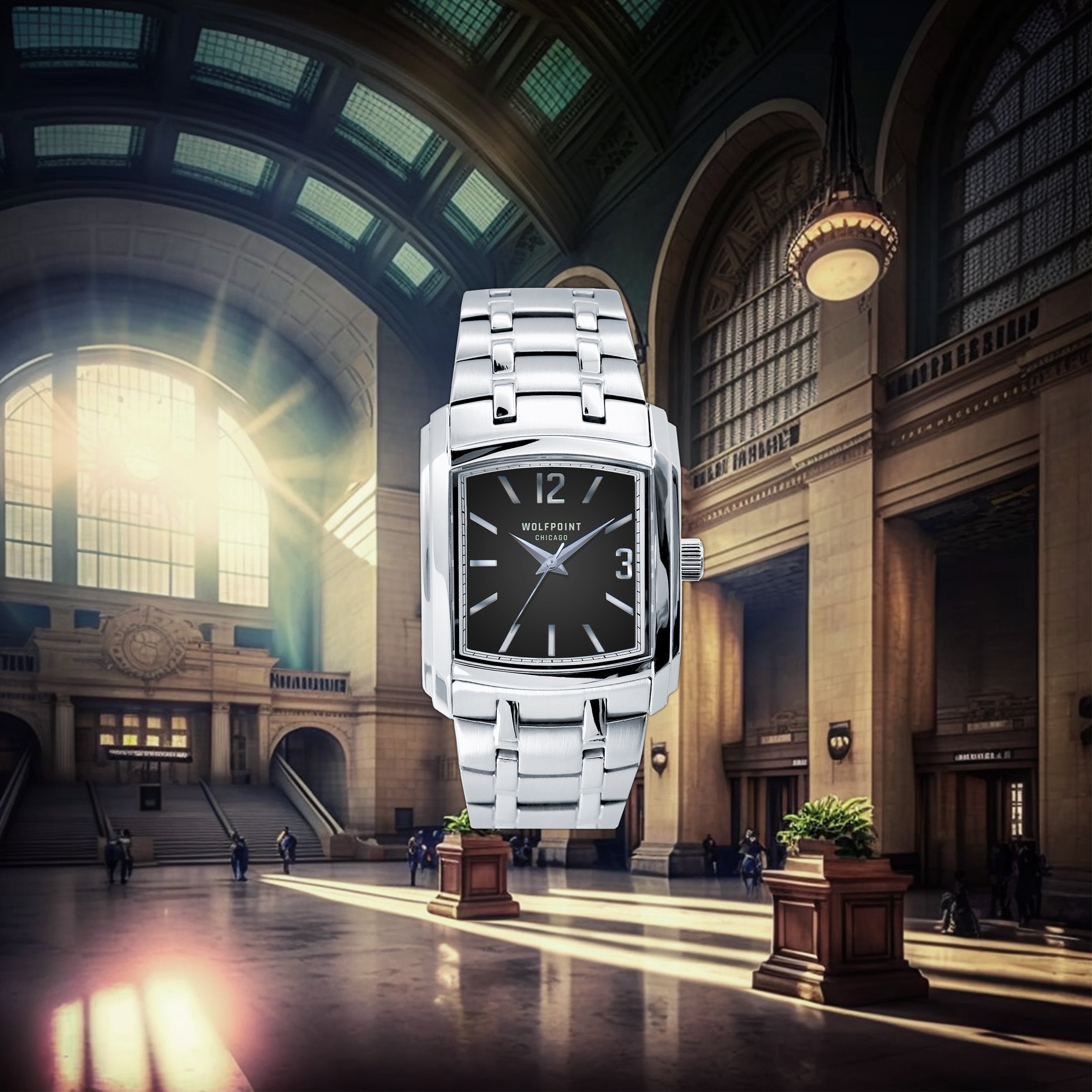 Inspired by Chicago railway history, tailored for the modern gentleman. This finely polished stainless steel watch case resembles the masculine rectangular shape of a train cart and window, yet with a thoughtful and fine finish on its surface and the edges.