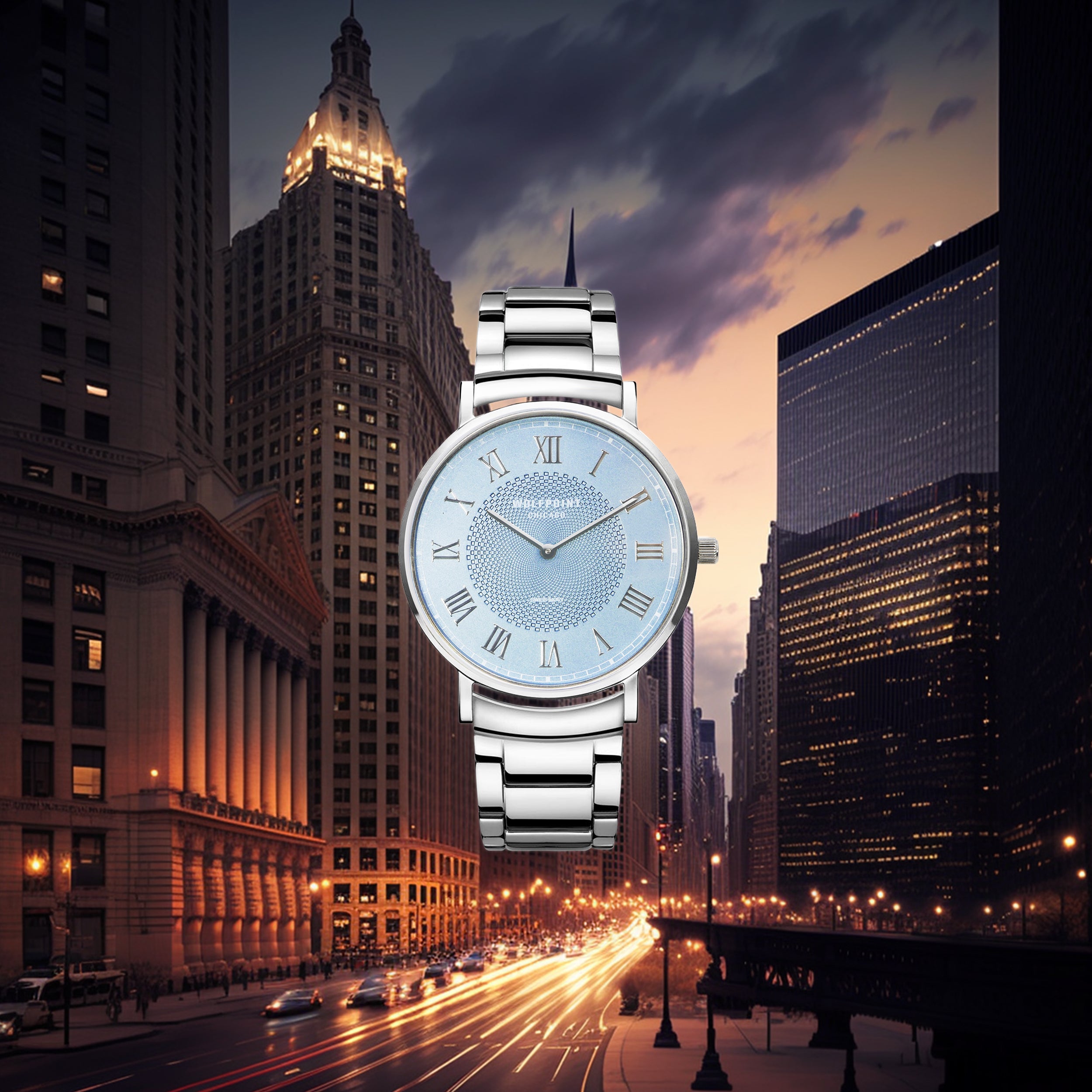 6.5mm thick and 40.5mm diameter. We engineered it to be as slim as possible. This two-hand watch can easily be the most versatile timepiece in your wardrobe, making it perfectly suited for a board meeting or Sunday brunch.