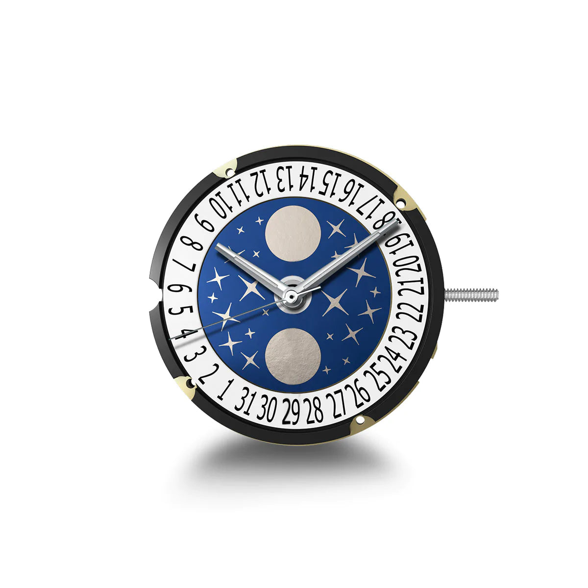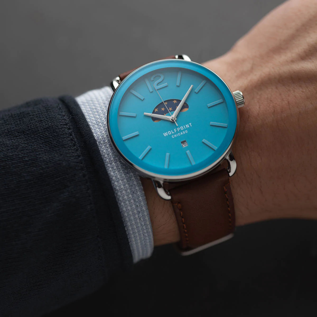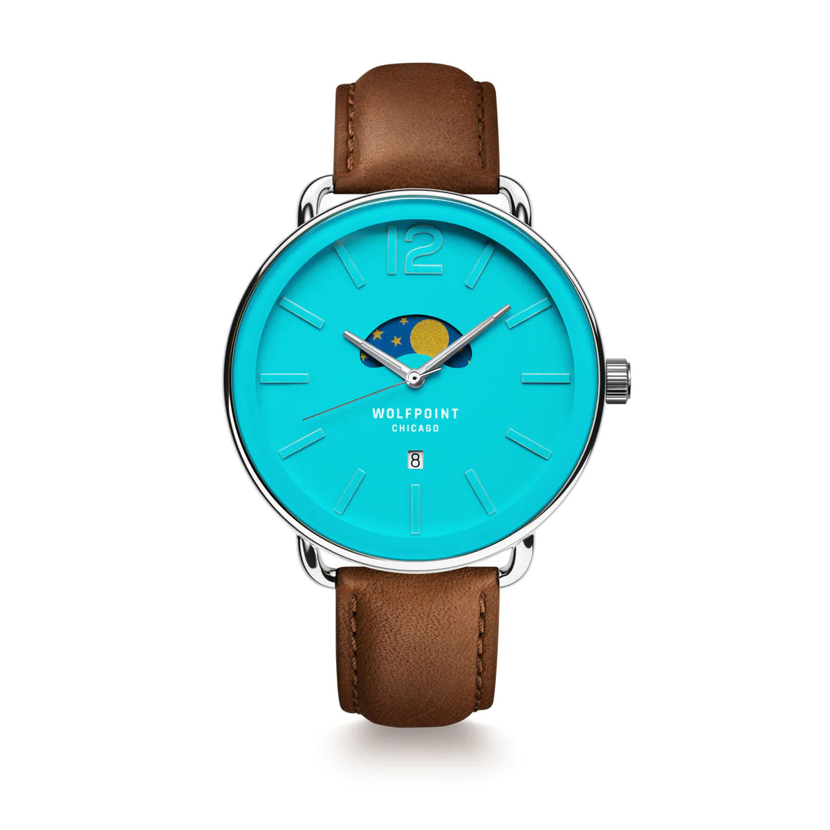 Modern and sophisticated, this classic enamel dial is adorned with a Cloud Gate- inspired window that displays the moon's phase as it can be seen in the night sky. Featuring dial color matching index sticks for a face to remember.