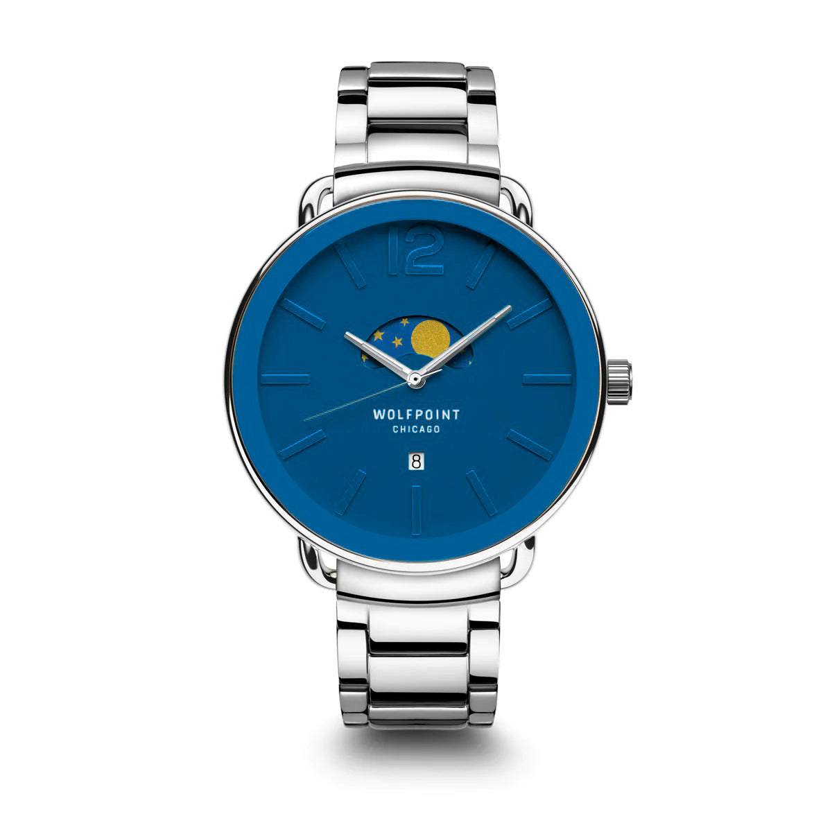 Shoot for the moon in confidence and style with this 43mm Wolfpoint watch, featuring a moon phase window to see the moon's phase at any time the night or day. With a 316L stainless steel case, minimal index sticks, and sapphire crystal for added durability, this sophisticated timepiece is sure to elevate any watch collection. Paired with a premium Horween Leather Strap that will only get better with age.