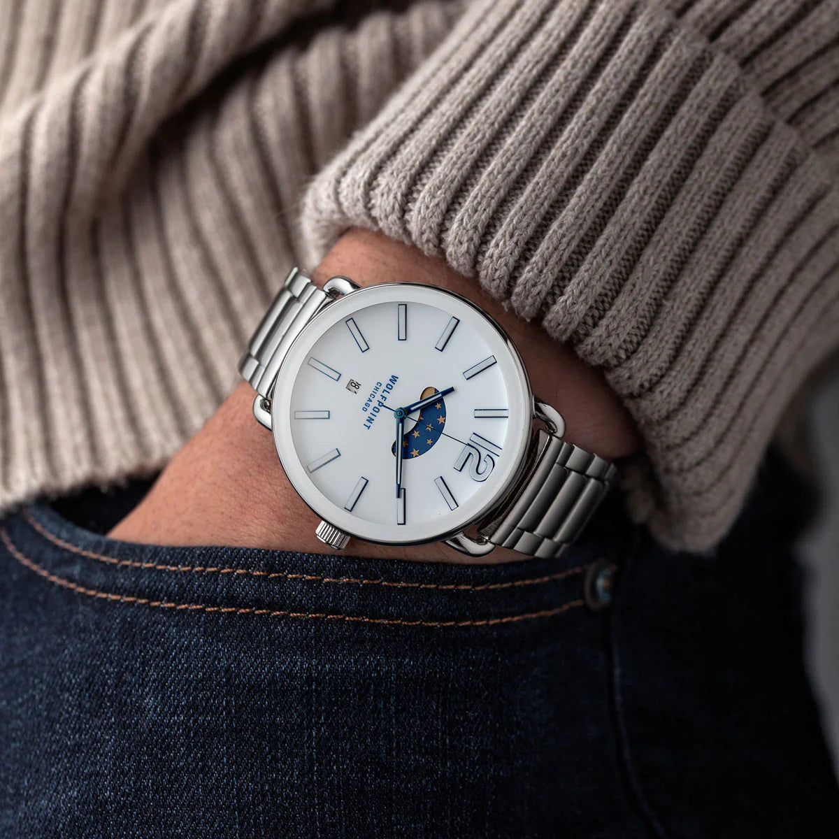 Modern and sophisticated, this classic enamel dial is adorned with a moon phase window that displays the moon's phase as it can be seen in the night sky. Featuring dial color matching index sticks for a face to remember.