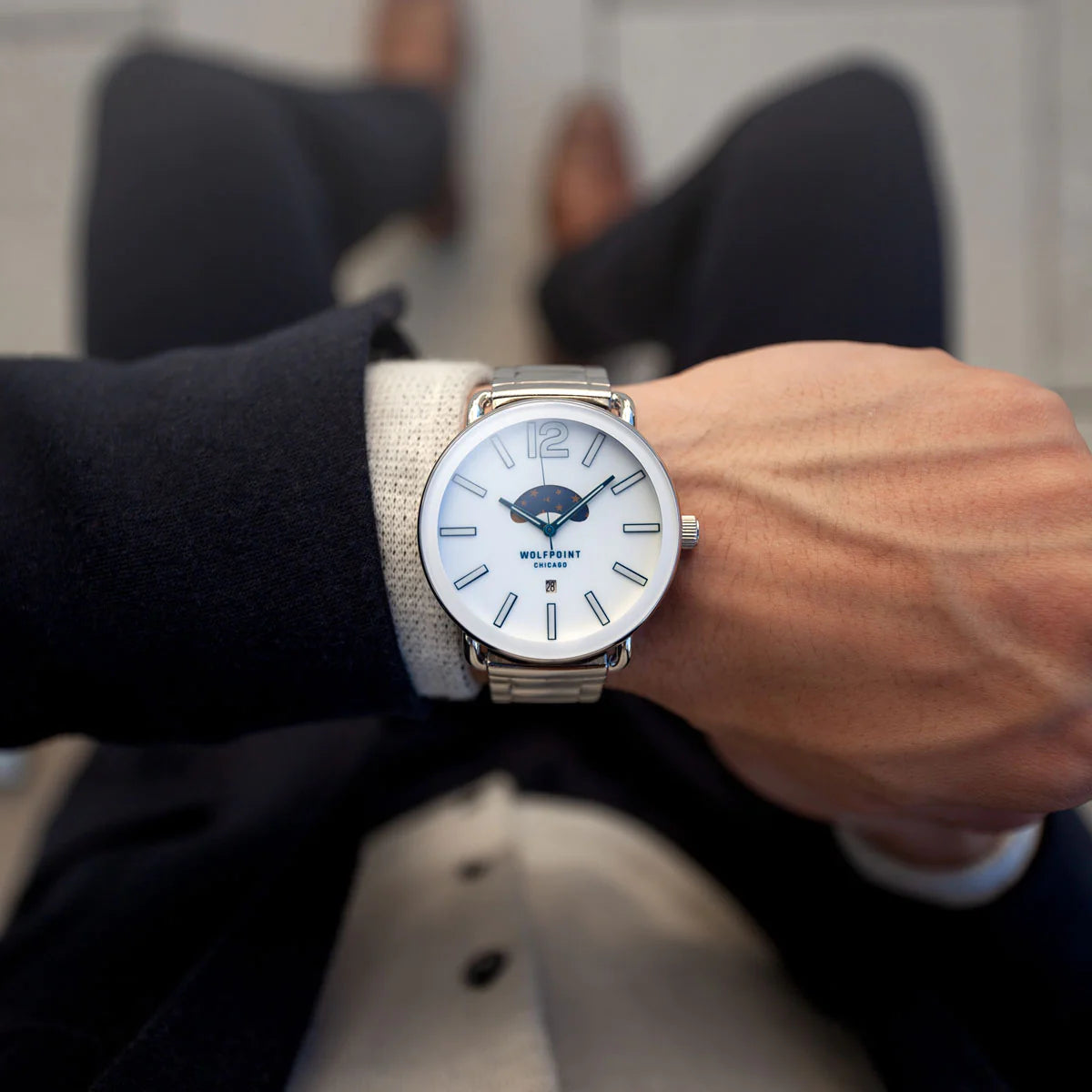 Made with 316L Stainless Steel. Designed to be both sturdy and comfortable. Interchangeable with a quick release spring bar, this strap was designed to compliment our Chicago Moon collection.