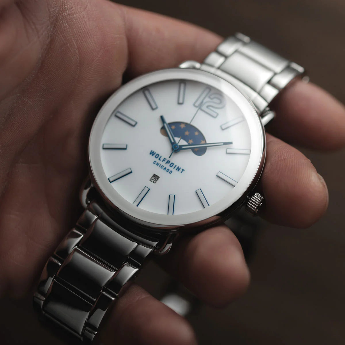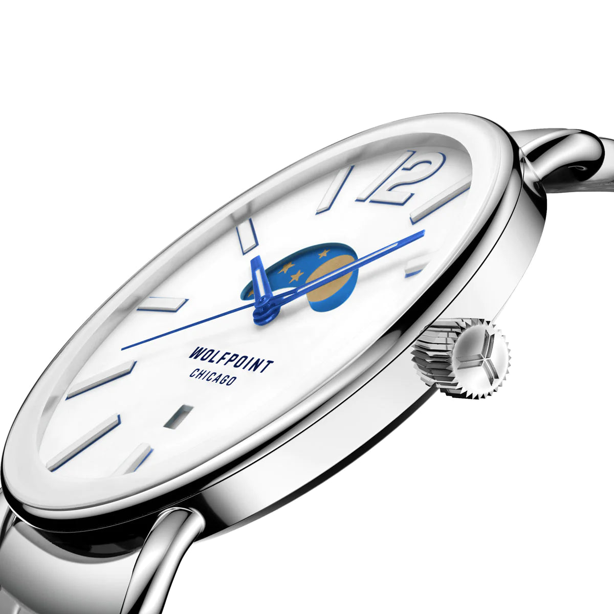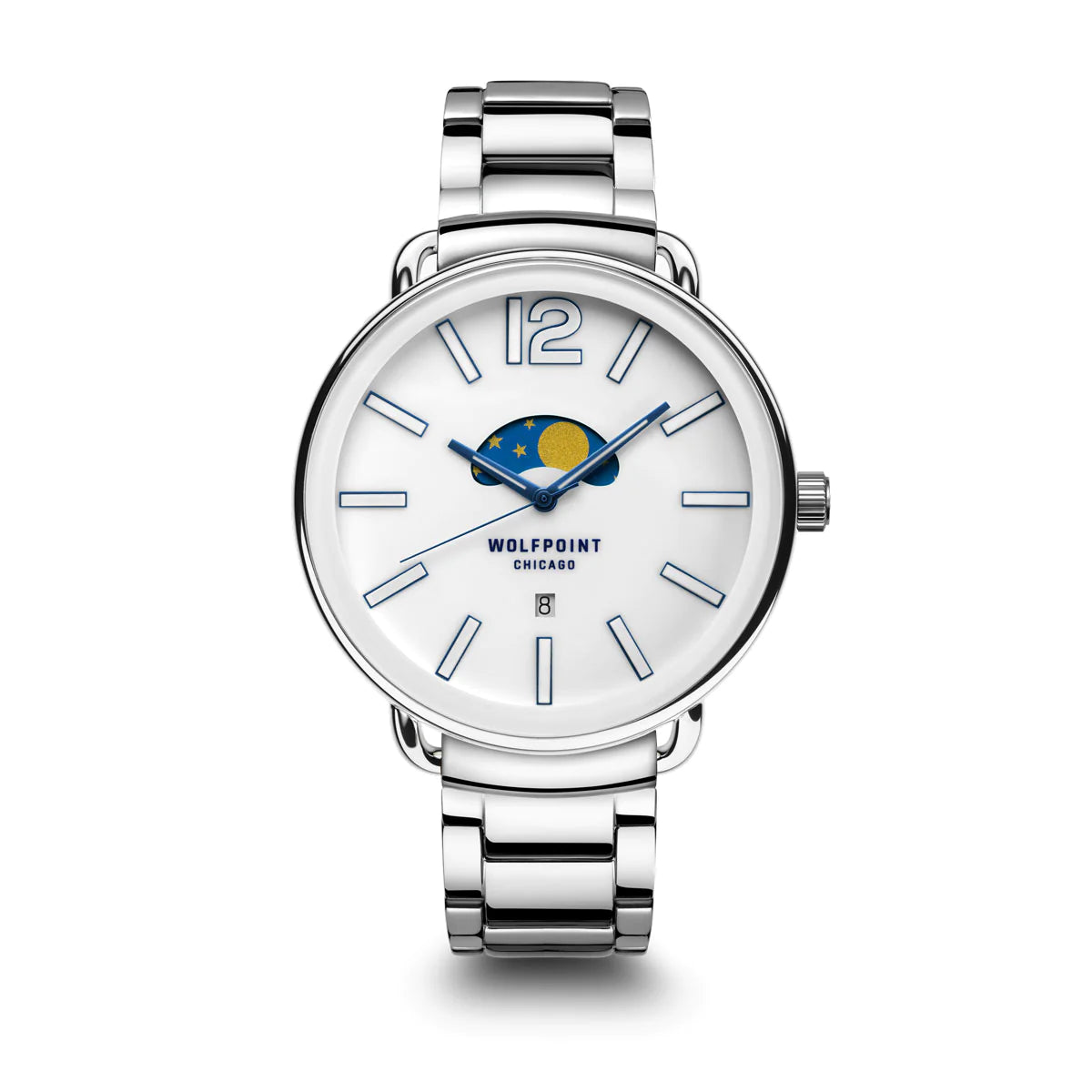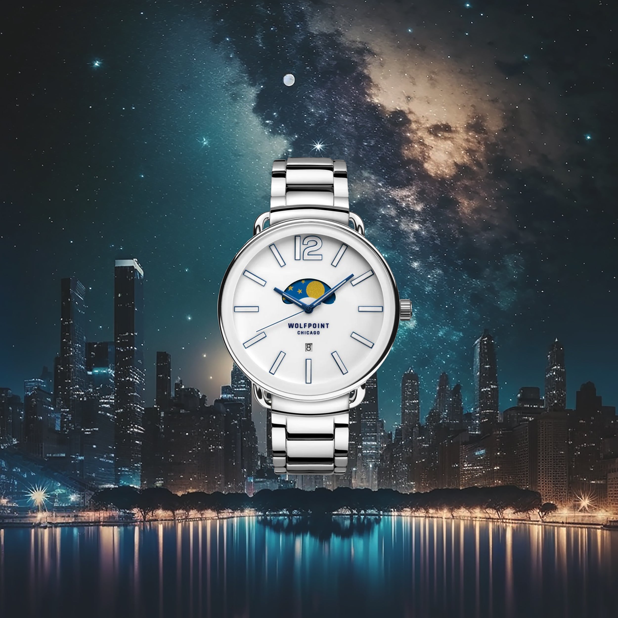 A work of public art in Millennium Park at the heart of Chicago. The sculpture, which is officially titled Cloud Gate, is one of the world’s largest permanent outdoor art installations, it weighs about 110 tons — roughly the same as 15 adult elephants. The stainless steel made monumental work was unveiled in 2004 and quickly became of the Chicago's most iconic sights. Our Moon collection bean shape moon phase window, is proudly inspired by this iconic sculpture of Chicago.